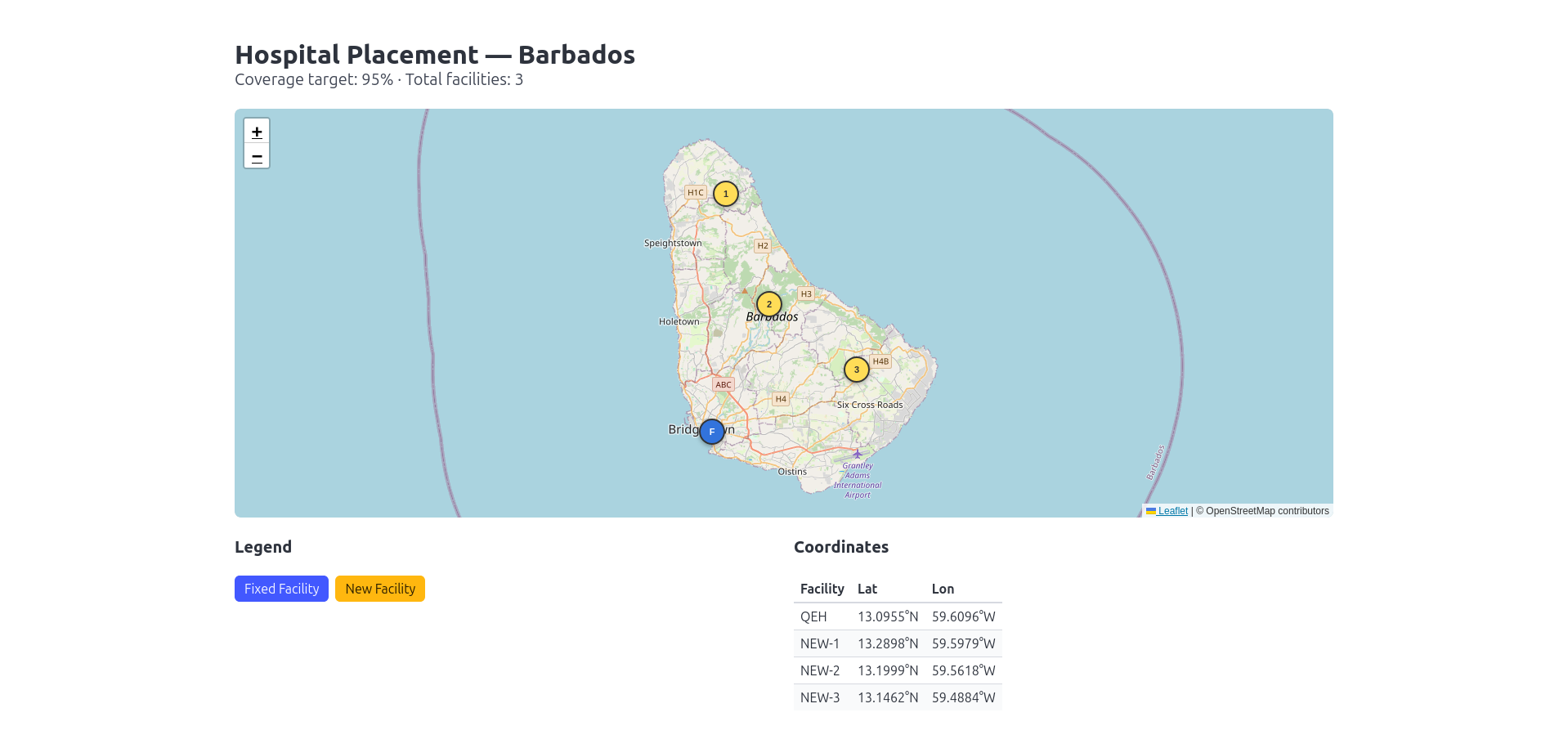 Important: This is a demonstration of optimization techniques using Barbados as an illustrative example. Real healthcare infrastructure planning requires actual population data, road networks, healthcare utilization studies, regulatory constraints, and domain expertise. The parameters and simplifications presented here are for educational purposes to demonstrate the methodology.